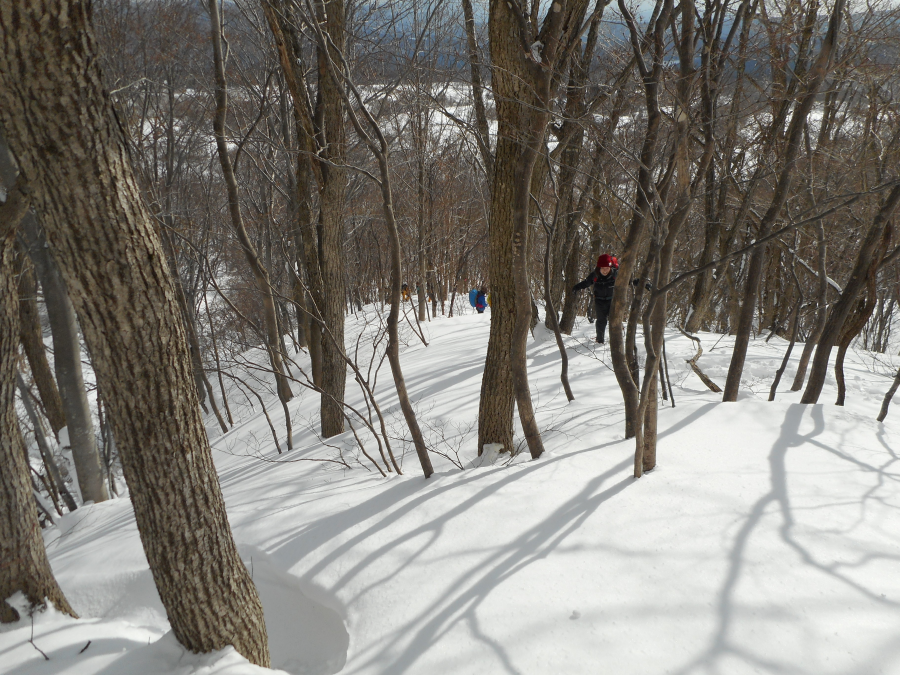 遊佐町の農林漁業体験実習館「さんゆう」を起点にしたフィールドです。駐車場は施設利用の方に配慮し、道路南側の駐車場をご利用ください。アクセス道路は月光川ダムまでは積雪状況によっては大変な時もありますが、ダムから先は豪快な消雪道路です。後輪駆動車の方は念のためタイヤチェーンをご持参ください。 さんゆう前の冬季レクリエーション施設(スキー場)の斜面を登りきると、一面の大雪原が広がります。ここは春から秋まで畑になっています。この大雪原をどん詰まりまで行くと、その先は雑木や杉の斜面、そしてブナの森へ続きます。 このフィールドは初めての方でも天気が良ければ楽しめますが、やはり無理は禁物。どこまで登るかは、その時の天候と体力・気力しだい。当然ながら、沢筋の踏み抜きや雪崩、道迷いなどに十分な注意が必要です。 |